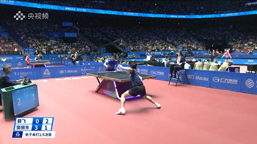 全運會男單1/8決賽上,上海隊的樊振東vs湖北隊的薛飛,樊振東越戰(zhàn)越勇,11-5連勝三局,最終以4-1戰(zhàn)勝薛飛,晉級8強。